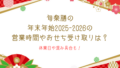 年末年始については、2025年12月の店舗カレンダーに年始の休業日や初売りの記載が確認できます。