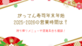 2025年12月31日〜2026年1月3日の4日間は全店でお持ち帰り営業が行われ、時間帯は10:00〜20:00が基準になります。